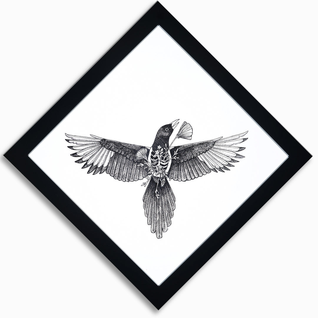 Fortune is a 14 by 14 inch original in a black wood and glass frame. This piece features a Yellow-Billed Magpie and native California wildflowers.